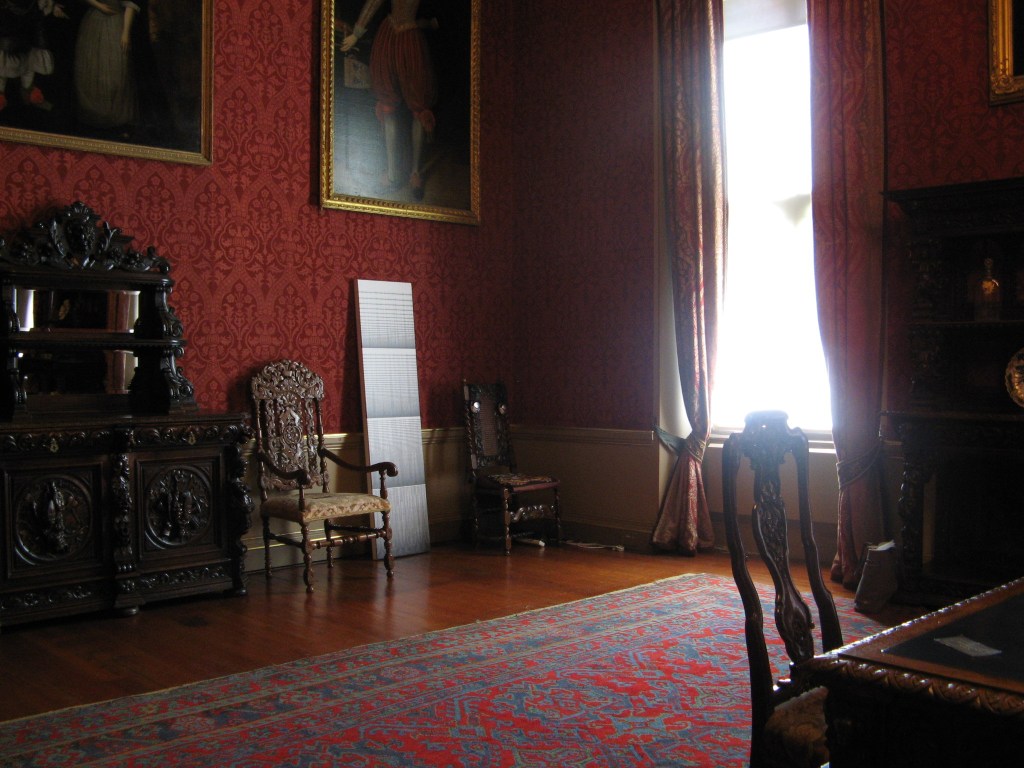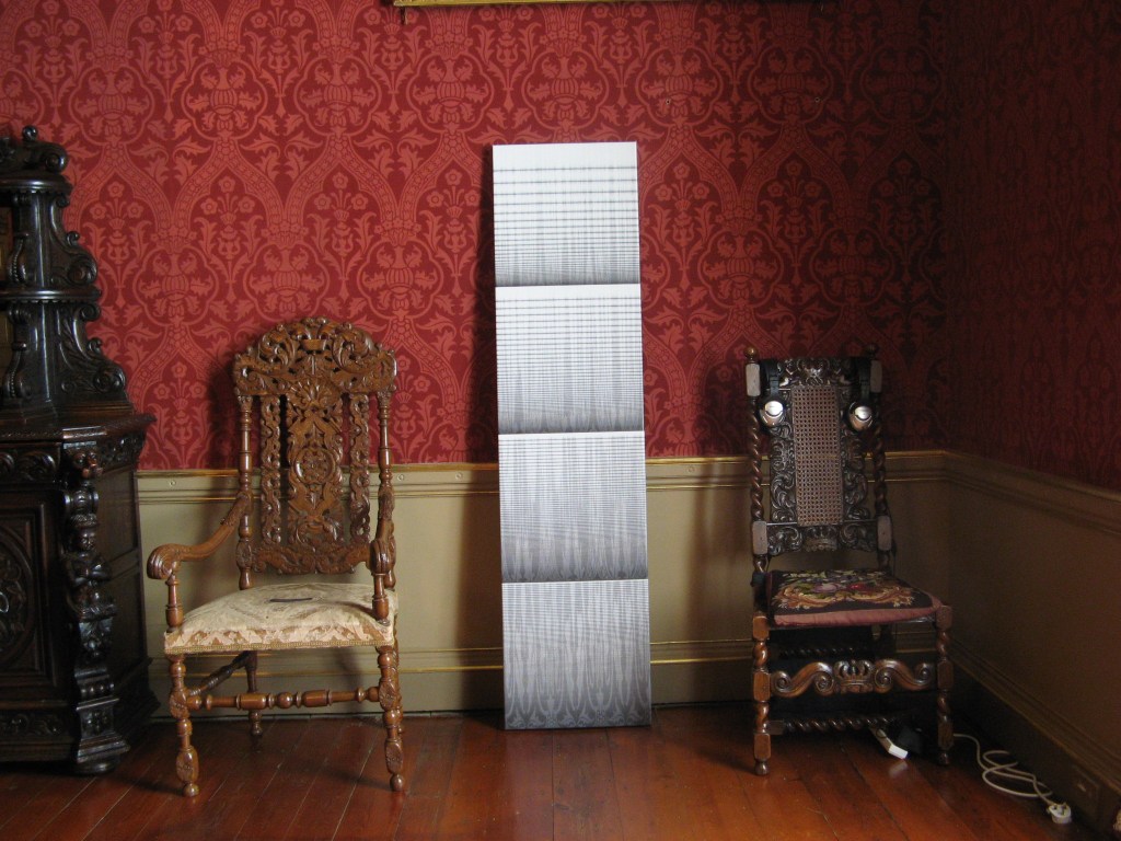 The work is inspired by the venue’s Victorian wallpaper. Computer software was used to convert a photograph of the wallpaper into sound, which was digitally edited and processed to produce a haunting atmospheric soundscape. The sound was also transferred back into images printed onto canvas, ghostly echoes of their origins.