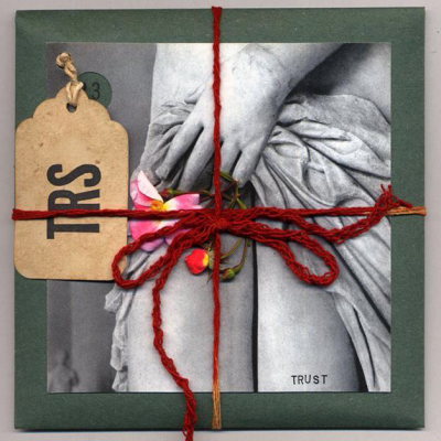 Following is the list of the artists involved, with track titles, in the order it will be heard. Attached is a picture of the front outer sleeve, each of which contains an individually collaged, stenciled, and stamped fold open photographic mini posters, w/factory pressed discs in sleeves, and accompanying paper ephemera. All tied up with red Indian thread…and sporting a hand stamped and distressed TRS tag…