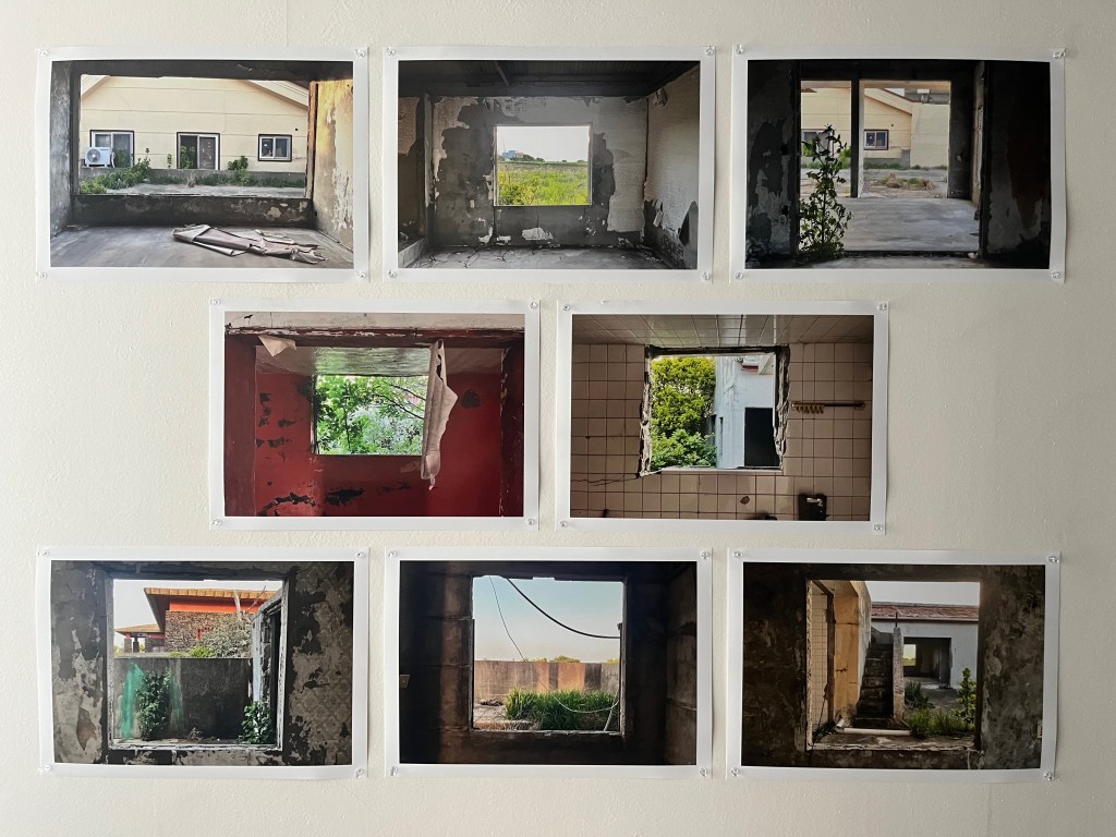 The sound was displayed with a series of eight photographs that focus on thresholds – views onto the outside from empty window openings and a collection of found objects: wallpaper, tile and concrete fragments.