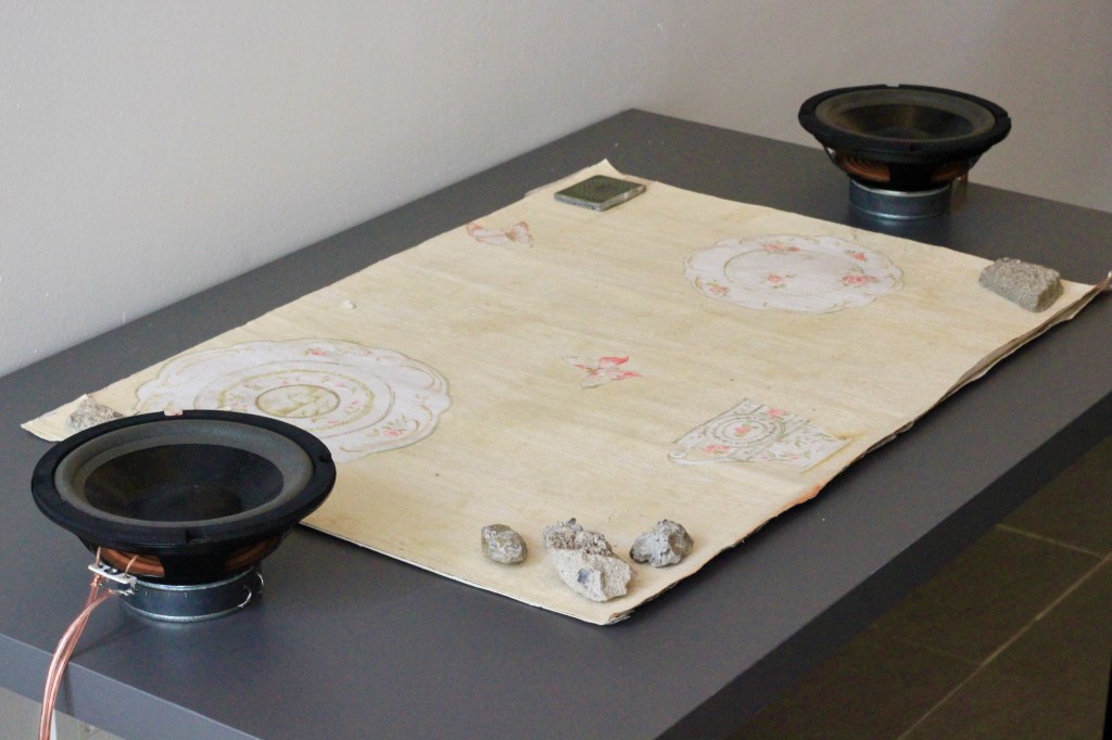 Two-channel sound, speakers, inkjet prints on paper, found objects, 2025